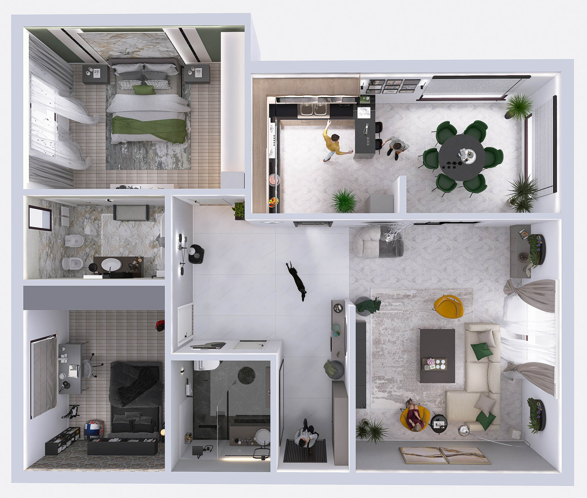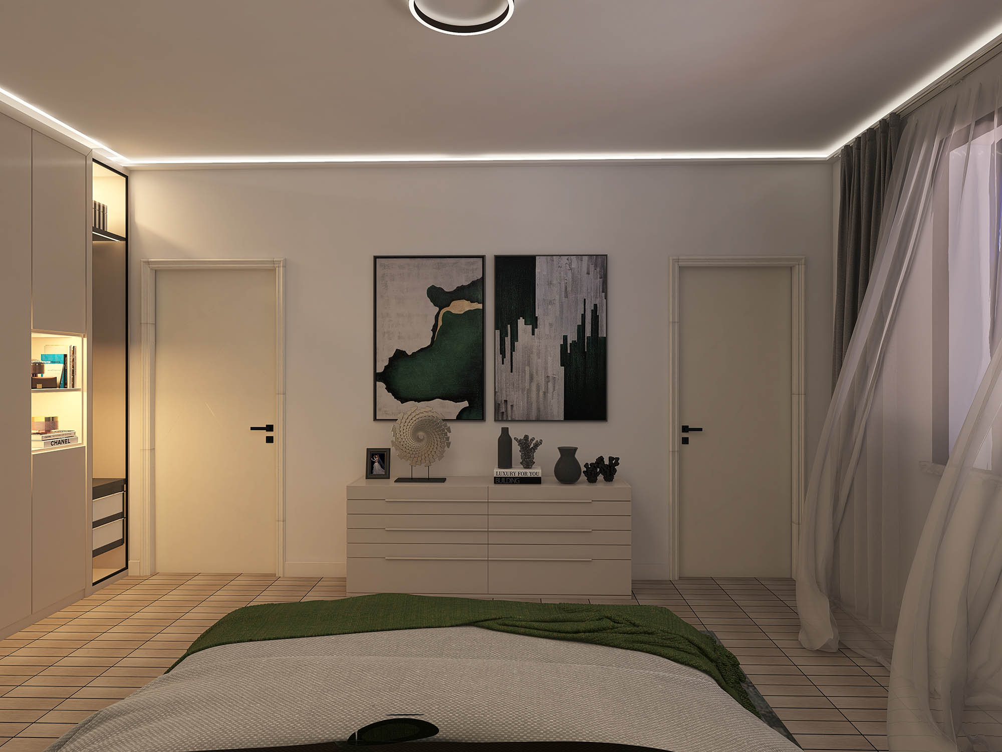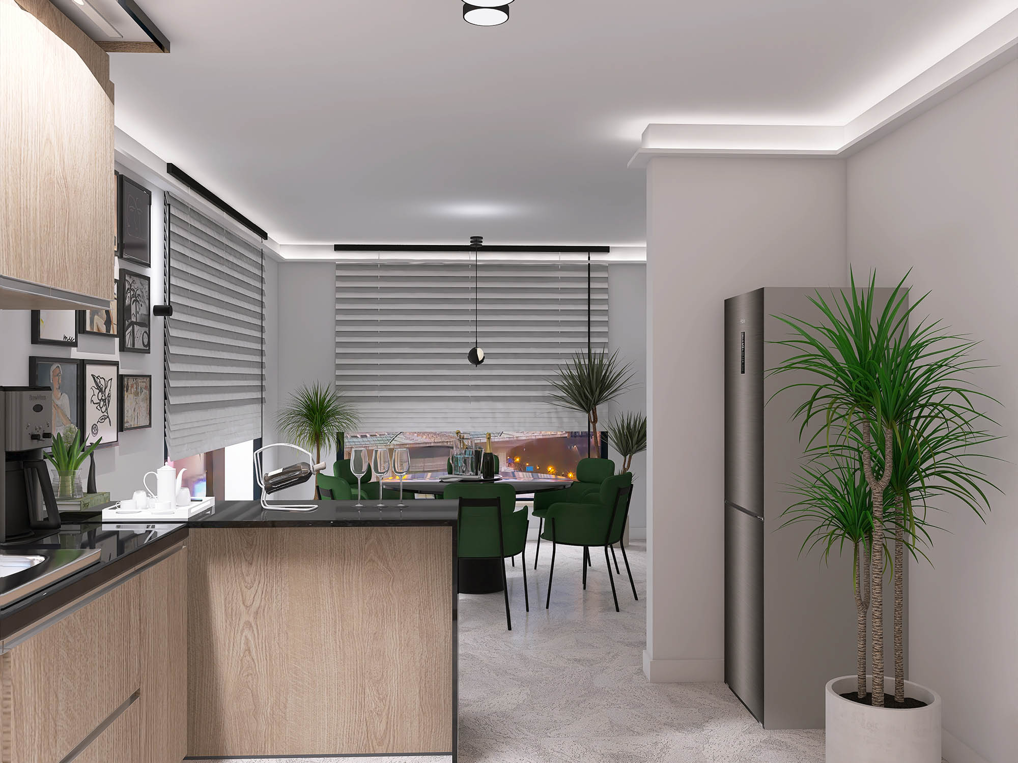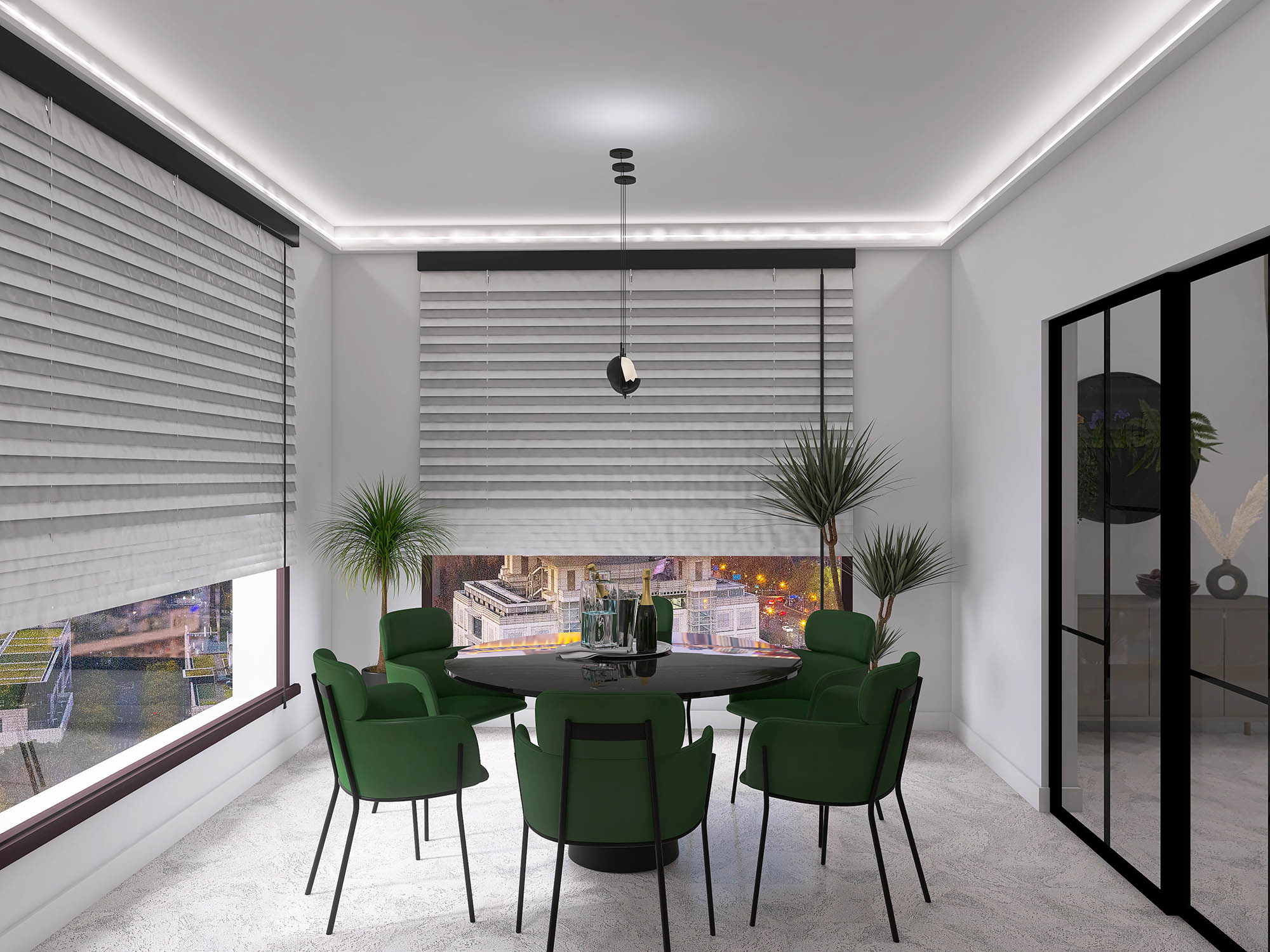 Culorile dominante sunt cele neutre, precum alb, negru, gri ?i tonuri îndr?zne?e de verde pentru a aduce dinamism ?i accente de culoare spa?iului amenajat.