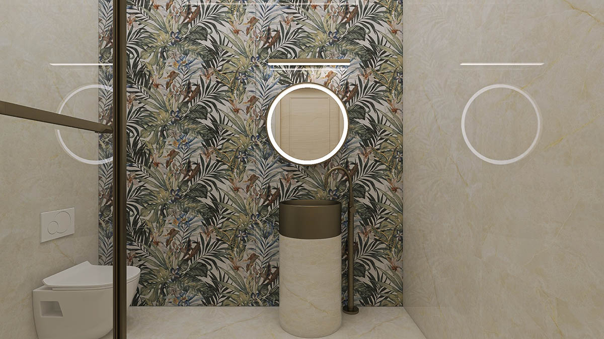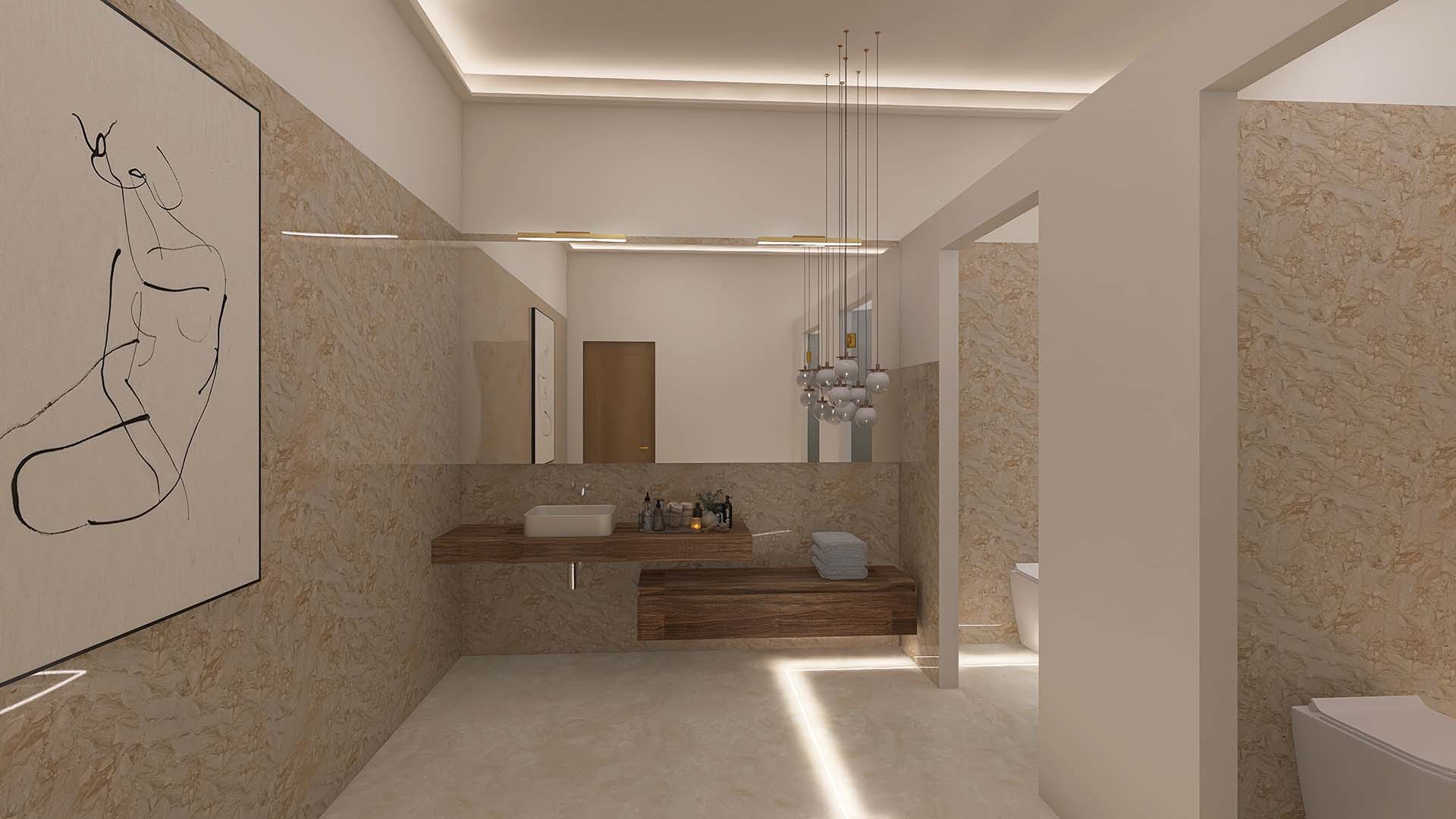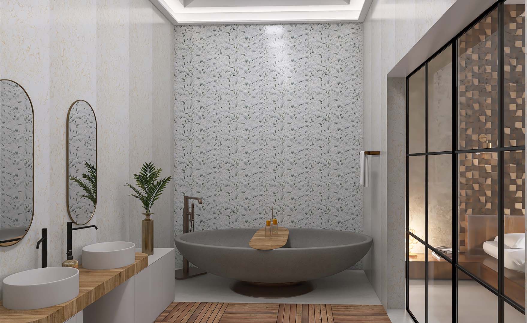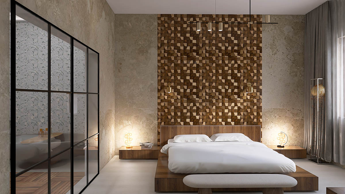 Apartamentul "STONEWOOD" dispune de living ?i dormitor dublu, zona de preparat ?i servit masa, dressing, baie cu cad? ?i du?. Amenajarea în stil contemporan este inspirat? de cele 2 elemente FENG SHUI piatra ?i lemnul.