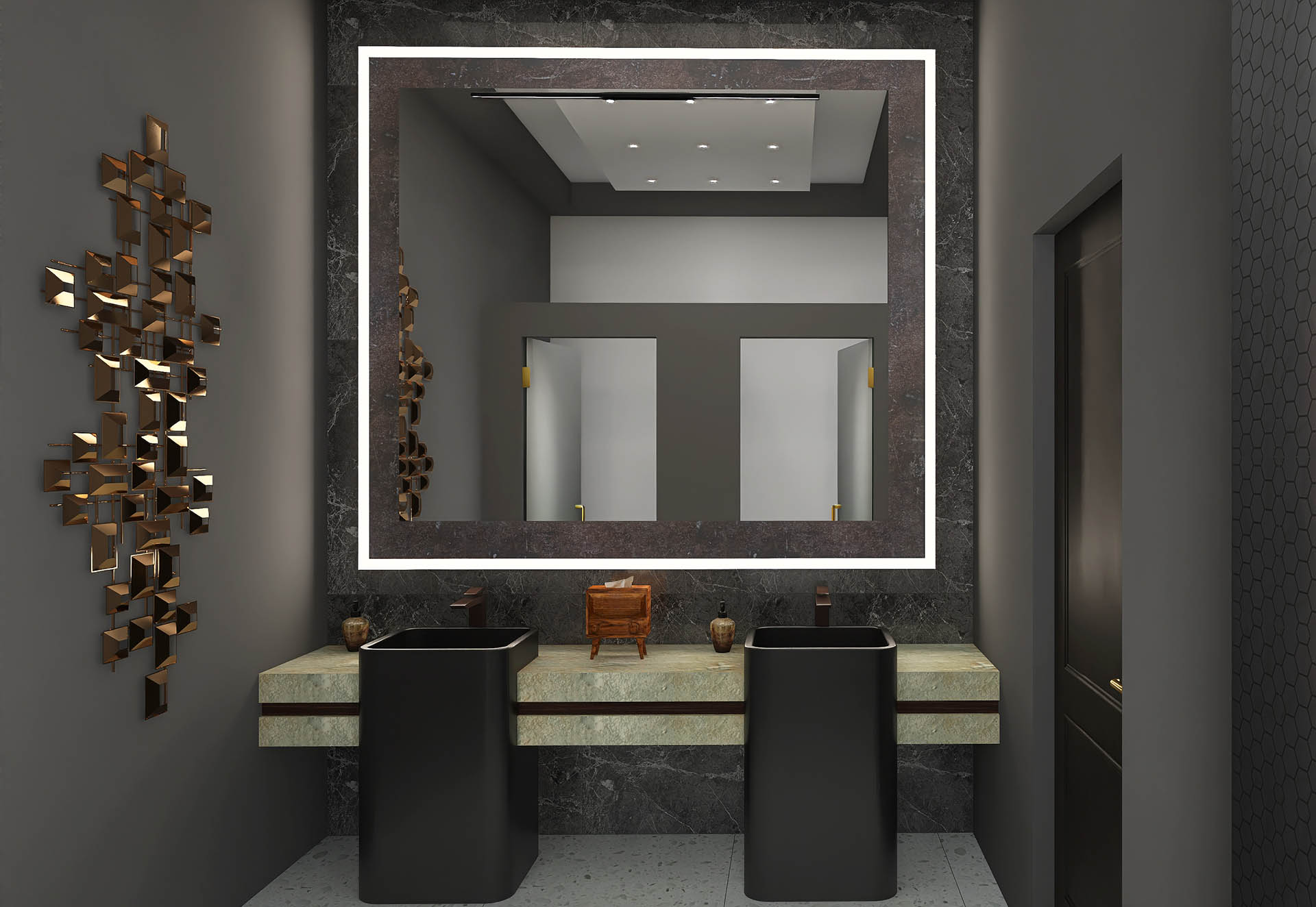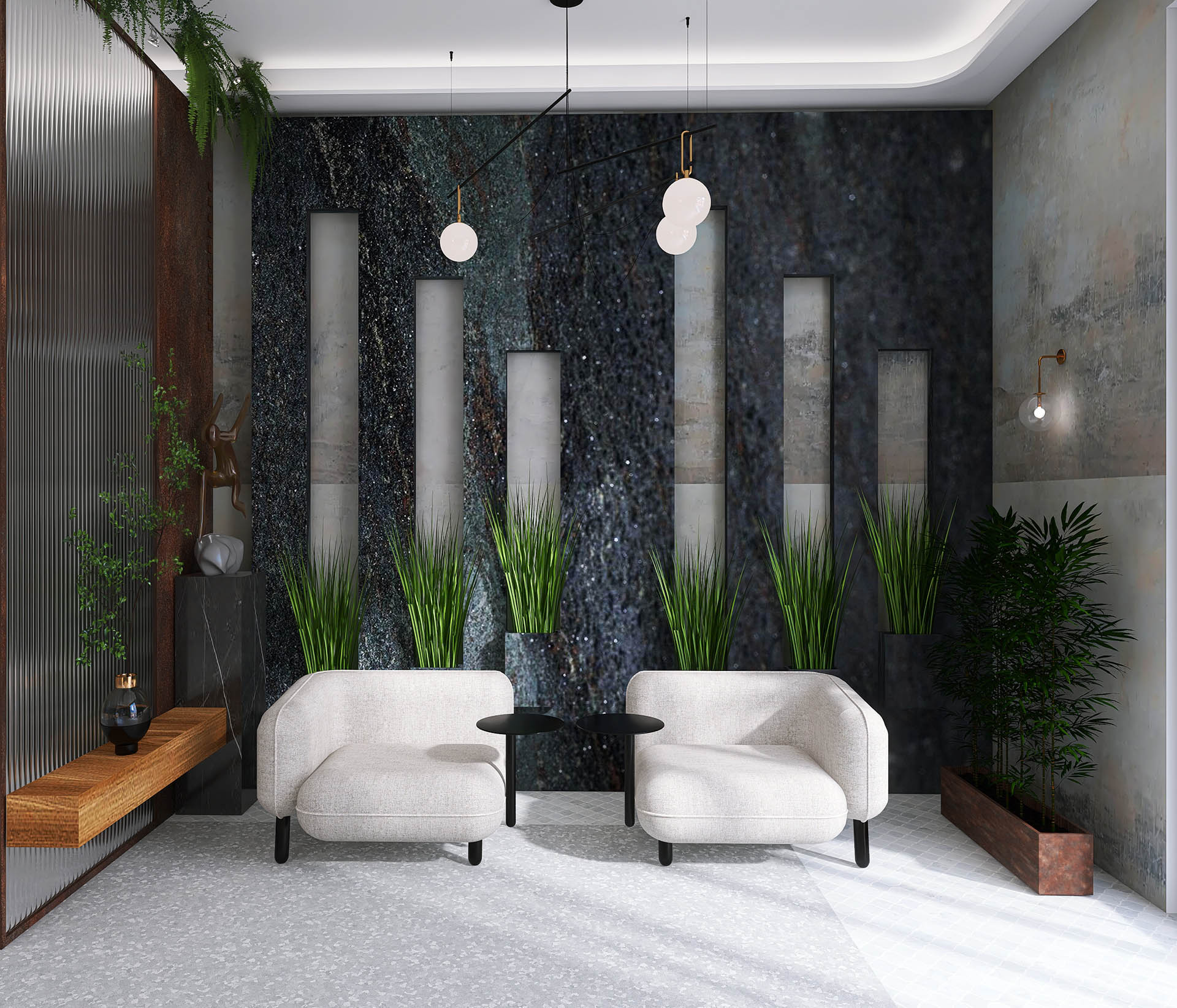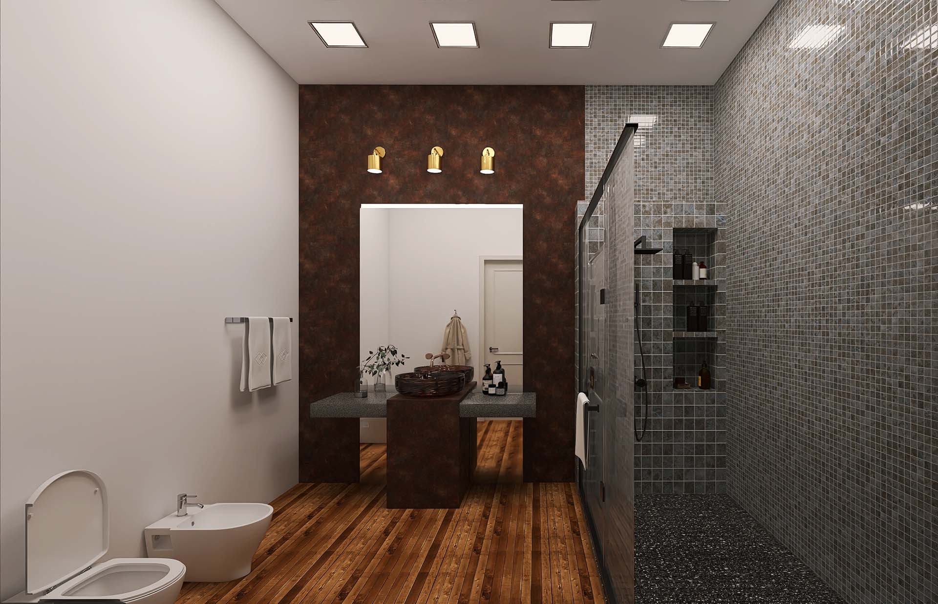 Apartamentul "STONEWOOD" dispune de living ?i dormitor dublu, zona de preparat ?i servit masa, dressing, baie cu cad? ?i du?. Amenajarea în stil contemporan este inspirat? de cele 2 elemente FENG SHUI piatra ?i lemnul.