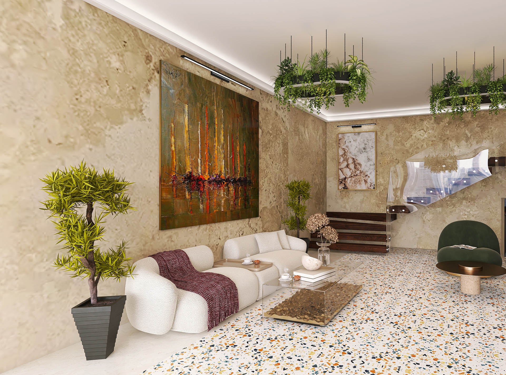 Stilul de amenajare este inspirat de natura, decorat cu plante, materiale ?i texturi naturale.