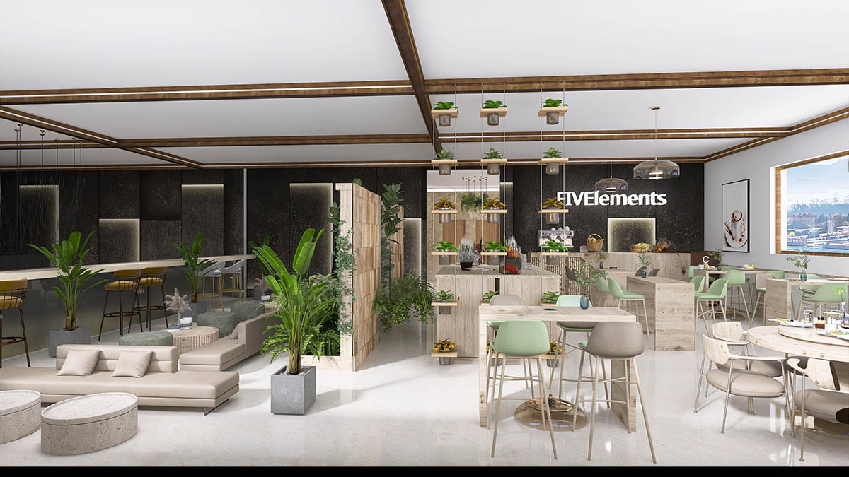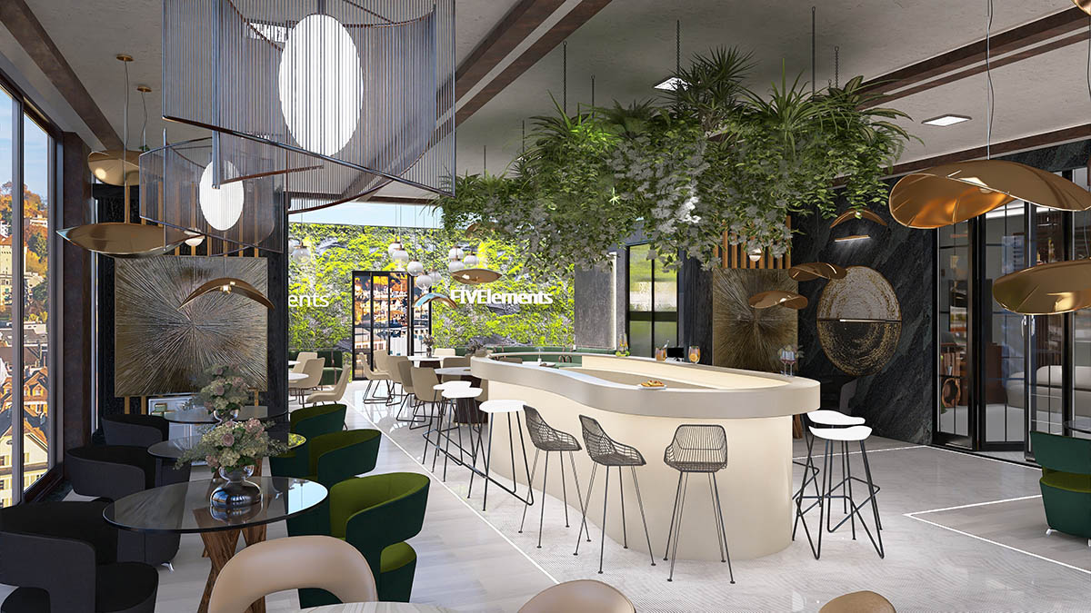 Cafeneaua ?Five Elements?, cu b?uturile sale aromate ?i produse de patiserie delicioase, ofer? oaspe?ilor un loc confortabil pentru relaxare ?i conversa?ii.